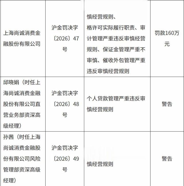 此外,因个人贷款管理严重违反审慎经营规则,尚诚消金直营业务部资深高级经理邱晓娟、风险管理部资深高级经理孙茜被同时予以警告。