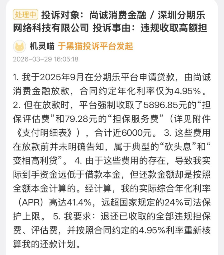有用户投诉称,尚诚消金通过分期乐平台向其放款时,收取合计近6000元的担保费用,致使其实际综合年化利率高达41.4%,远超“合同规定”的4.95%利率。